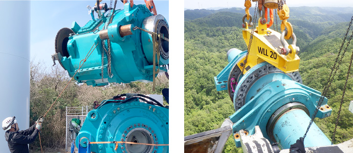 We provide replacement work for large parts such as step-up gears and main bearings in wind power generation facilities. We can handle the sequence of tasks from providing parts to suit the customer's needs (such as providing new products and repairing faulty parts) to installation, shortening the time from ordering to installation.